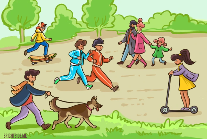 Spacer, jogging, jazda na hulajnodze – to zwykła, codzienna scena z parku. Ludzie cieszą się piękną pogodą, ale jeśli przyjrzysz się uważniej, zauważysz coś… apetycznie dziwnego!
