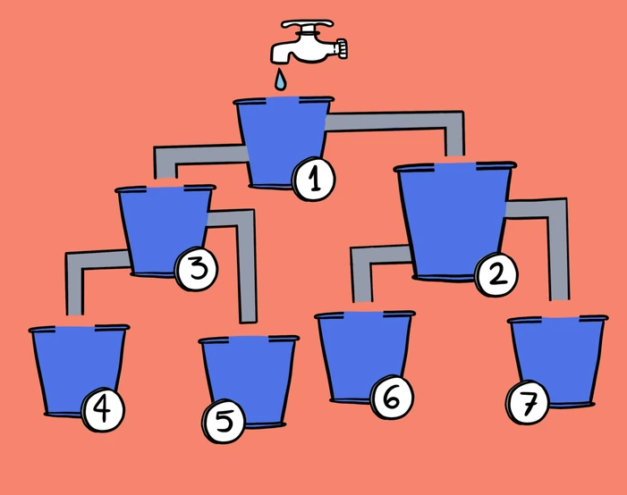 🔍 Twoje zadanie: Przeanalizuj układ rur i ustal, które wiadro napełni się jako pierwsze.